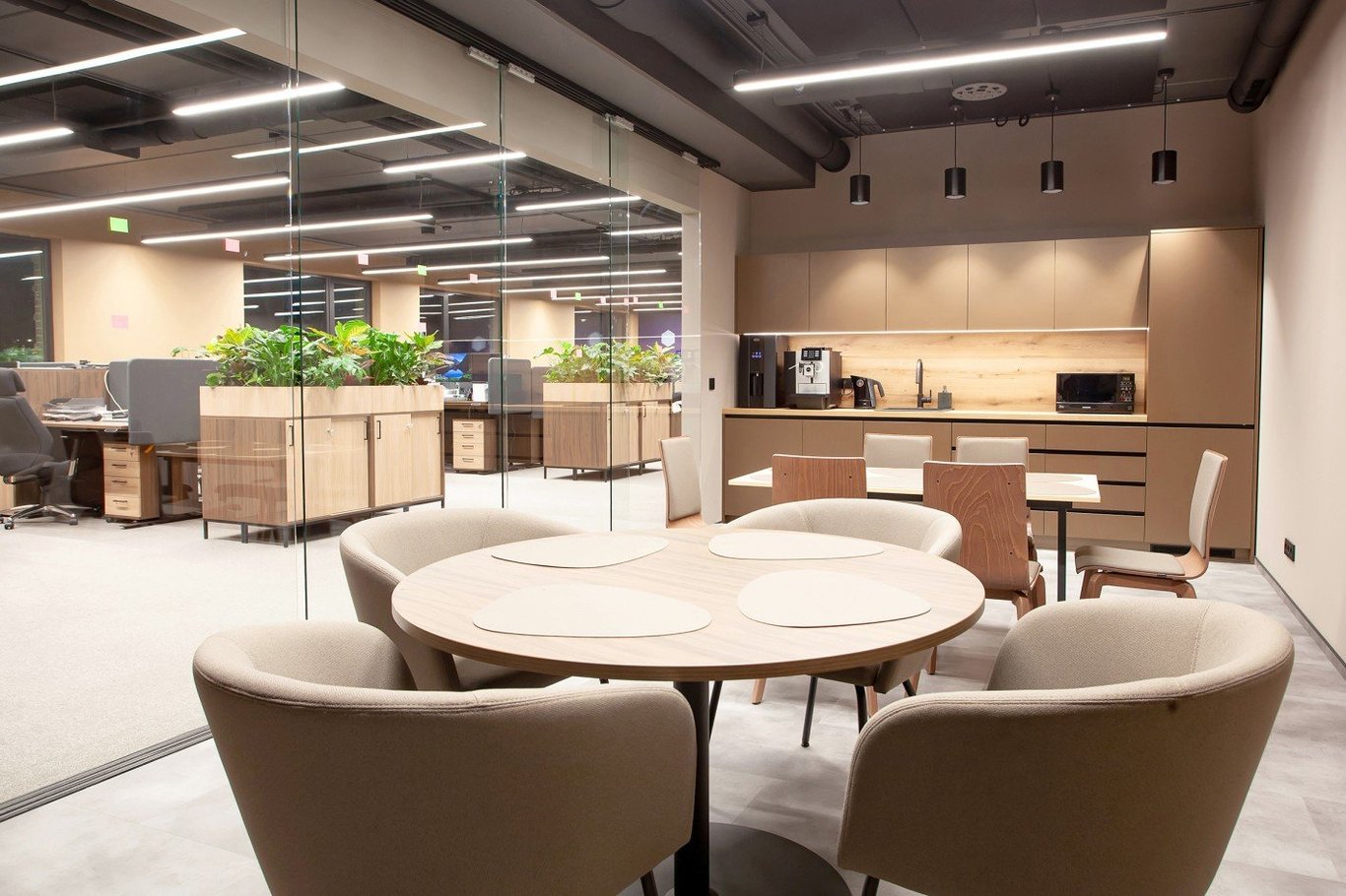 Ērtas un estētiskas atpūtas zonas ar biofīlo dizainu ne tikai rada patīkamu vidi, bet arī veicina darbinieku sadarbību un uzlabo pašsajūtu.