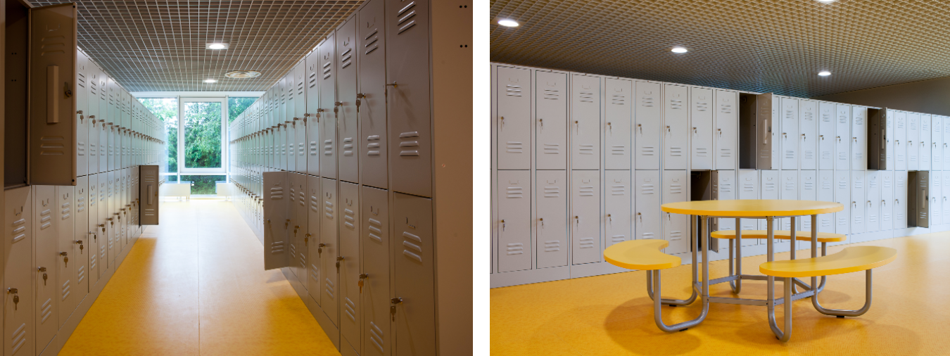Garderobēm tika izvēlēti metāla garderobes skapīši CAMPUS, kur katram skolēnam ir savs personīgais nodalījums, lai tajā var novietot gan apģērbu, gan citas personīgās mantas. Katrs no skapīšu nodalījumiem tikai pielāgots ar ciparu uzlīmēm, lai bērniem ir viegli atrast savu skapi.