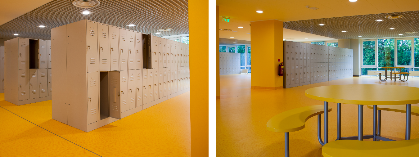 Košas grīdu un sienu krāsas apvienojumā ar neitrāliem mēbeļu materiālu toņiem rada dinamisku, gaumīgi līdzsvarotu kopskatu, kas stimulē un attīsta radošumu un pozitīvu gaisotni mācību telpās.