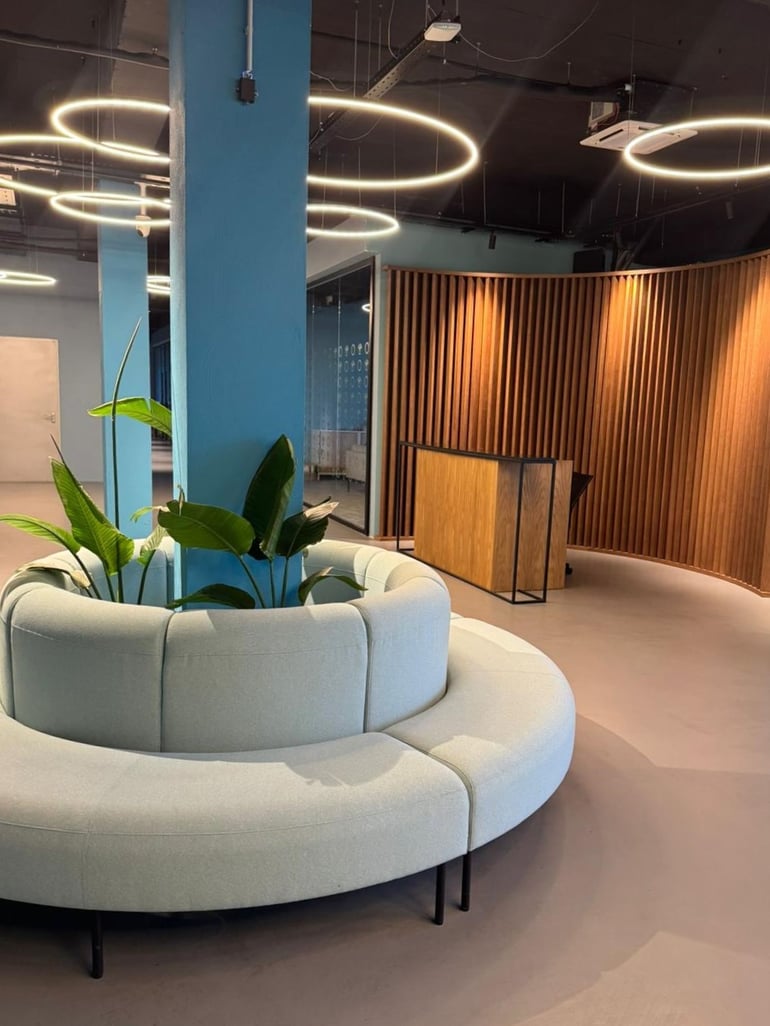 Dizaina mērķis bija radīt telpu, kur gribas būt, nevis tikai strādāt — spēles un kustības sajūta, nevis statiska ofisa ikdiena.