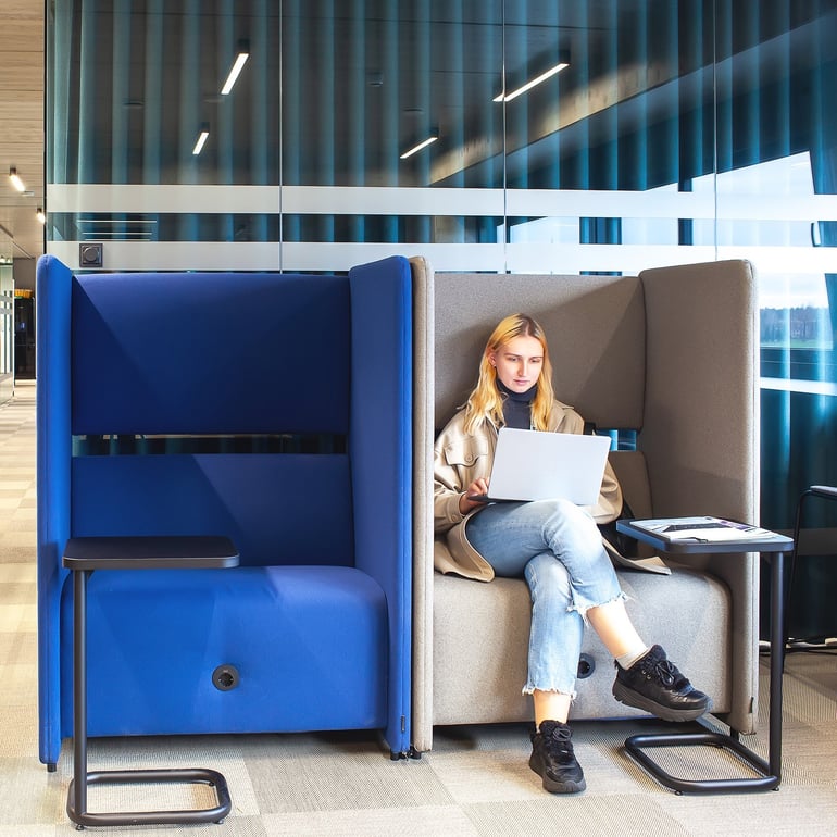 Lai nodrošinātu netraucētu darbu, birojā pieejama gan atsevišķa klusuma telpa ar tradicionālajām darba vietām, gan mēbeles ar skaņu slāpējošām īpašībām.