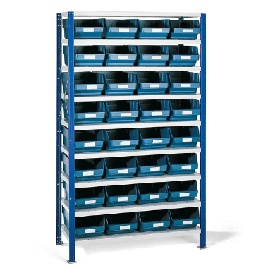 Plauktu sistēma ar 4 vertikāliem statņiem, 9 plauktiem, 32 plastmasas kastēm ar atvērtu priekšpusi un 100 etiķetēm.