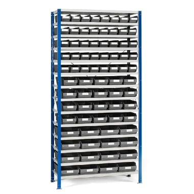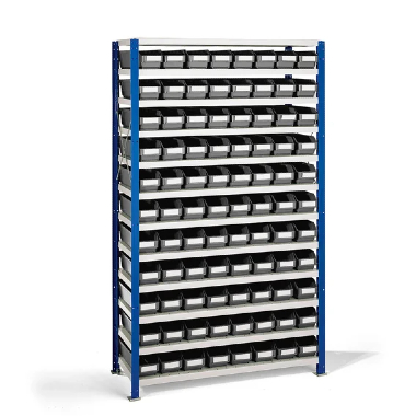 Nokomplektēta plauktu sistēma ar 4 vertikāliem statņiem, 12 plauktiem, 88 plastmasas kastēm ar atvērtu priekšpusi un 100 etiķetēm. Praktisks, ietilpīgs plaukts, kurā var uzglabāt daudz nelielu priekšmetu. Plaukts ir piemērots izvietošanai dažādās telpās, piemēram, birojos, noliktavās, darbnīcās, ražotnēs, arhīvos.