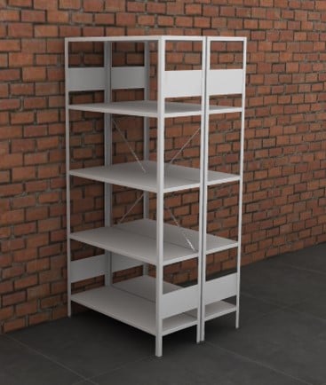 Apraksts | Konstrukcija sastāv no 2 abpuseji savienotām sekcijām no kurām katra balstās uz 4 statņiem ar plastikāta pamatnēm. Aizmugurē savienoti ar krusteniskām atsaitēm. Plauktu regulēšanas solis 40mm |