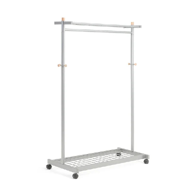 Metāla apģērbu statīvs ar koka elementiem. Statīvs cepurēm un apģērbiem aprīkots ar ritenīšiem. Tajā ir vieta apmēram 30 apģērbu pakaramajiem. Komplektā ietilpst seši apģērbu pakaramie.